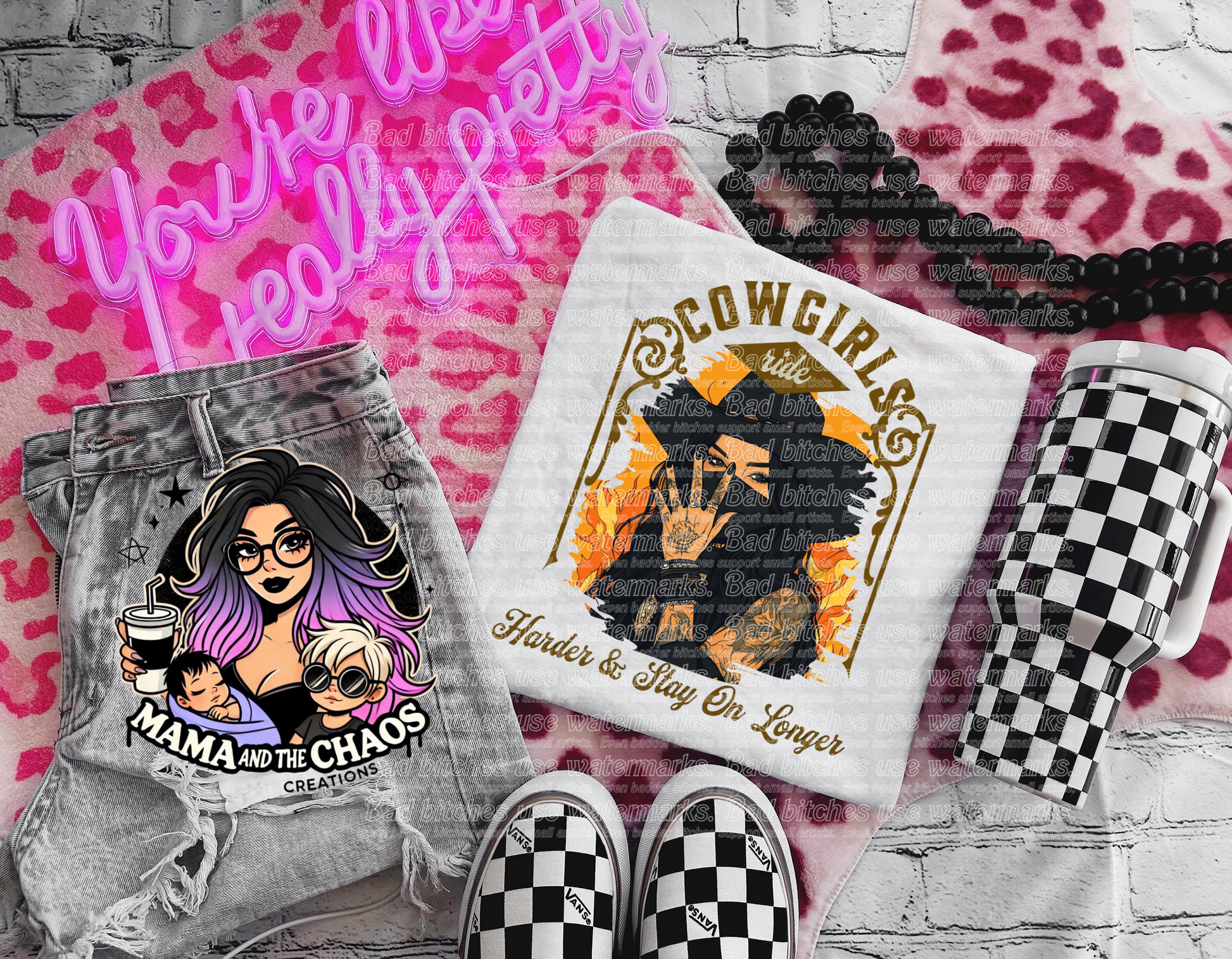 Unleash your inner cowgirl with this bold “Cowgirls Ride Harder & Stay On Longer” design. Featuring a striking silhouette of a cowgirl surrounded by fiery accents and intricate details, this graphic radiates strength and confidence. Perfect for those who embrace the wild spirit of the rodeo or simply love to stand out. Available in both T-shirts and hoodies in classic black or crisp white, this piece is crafted for comfort and durability, making it ideal for any occasion. Ride strong, stay fierce, and let your style speak volumes!