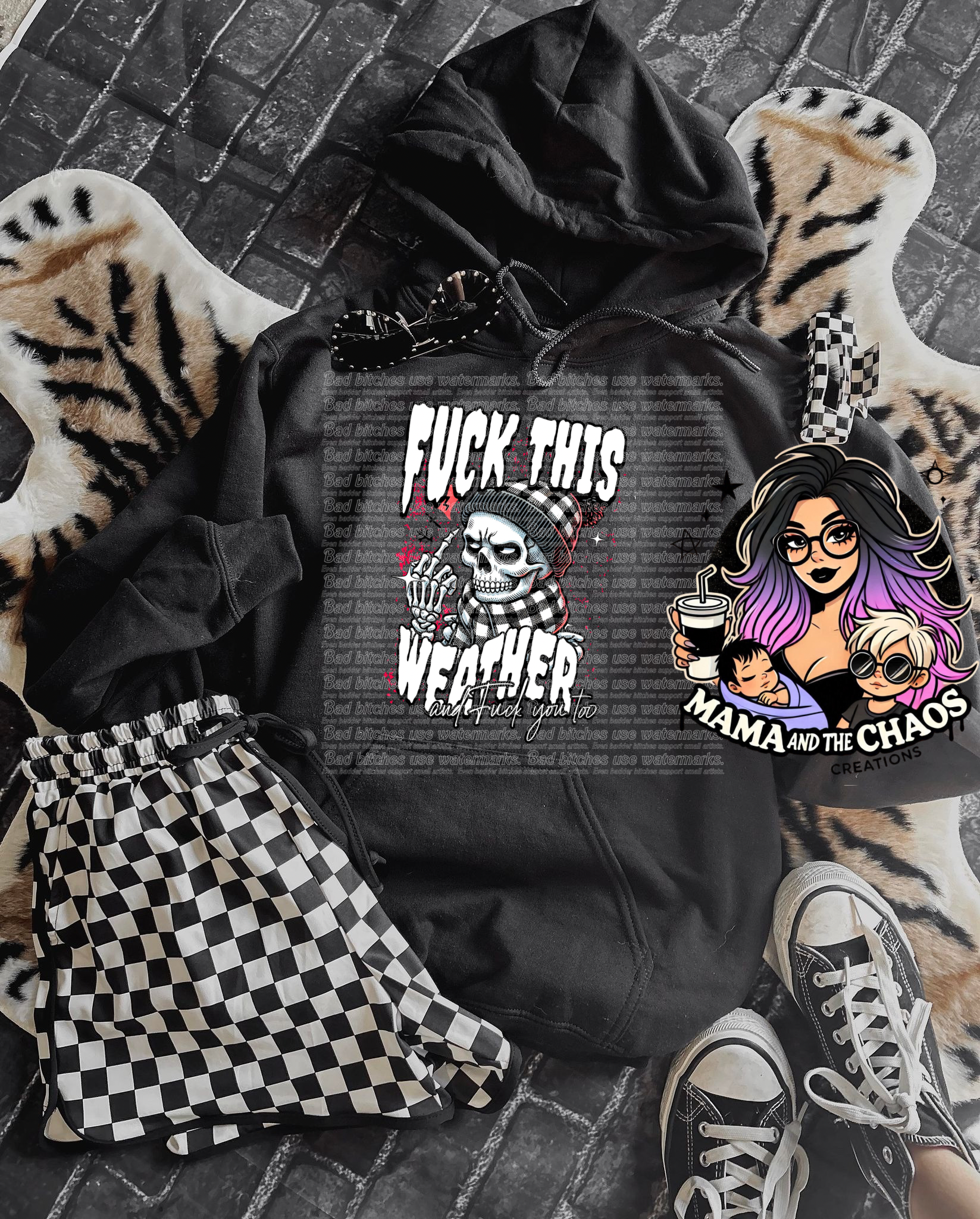 Express your frustration with a bold attitude with this “F*** This Weather” design. Featuring a rebellious skeleton dressed for the cold, complete with plaid details and a cheeky message, this graphic is perfect for those who aren’t fans of chilly days. Available in T-shirts and hoodies in classic black, this design is crafted from premium materials to ensure comfort and durability. Whether you’re braving the cold or staying cozy indoors, this piece is perfect for making a statement while staying stylish. Let the world know exactly how you feel about the weather!