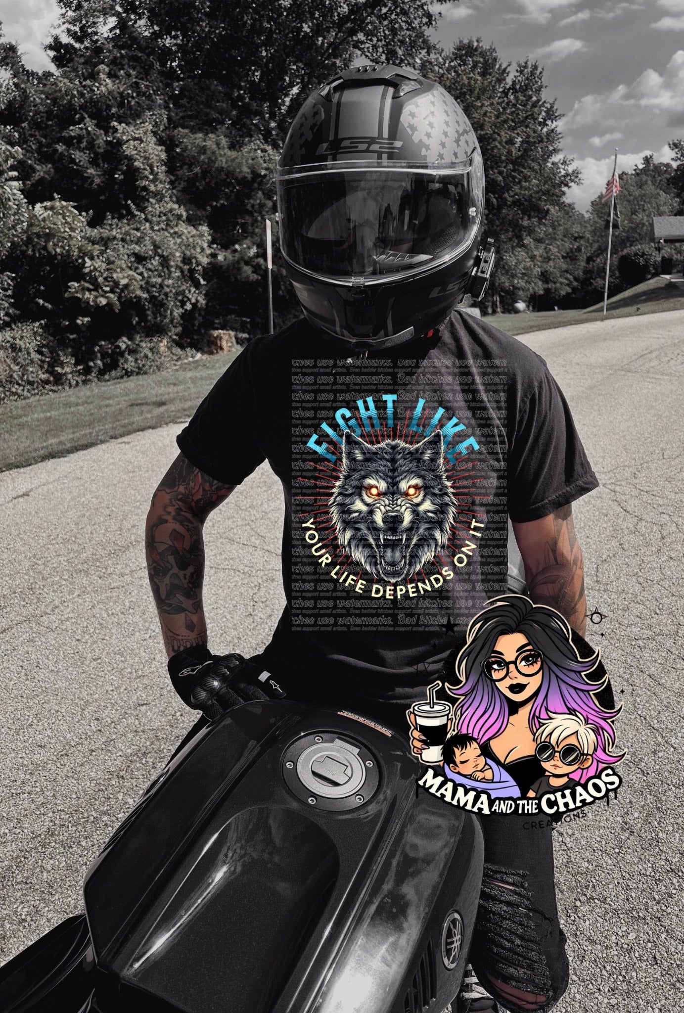 This isn't just a tee-it's a statement. For the relentless, the warriors, and the ones who refuse to back down. Featuring an intense glowing-eyed wolf, this shirt embodies the spirit of those who fight ever day like their life is on the line.