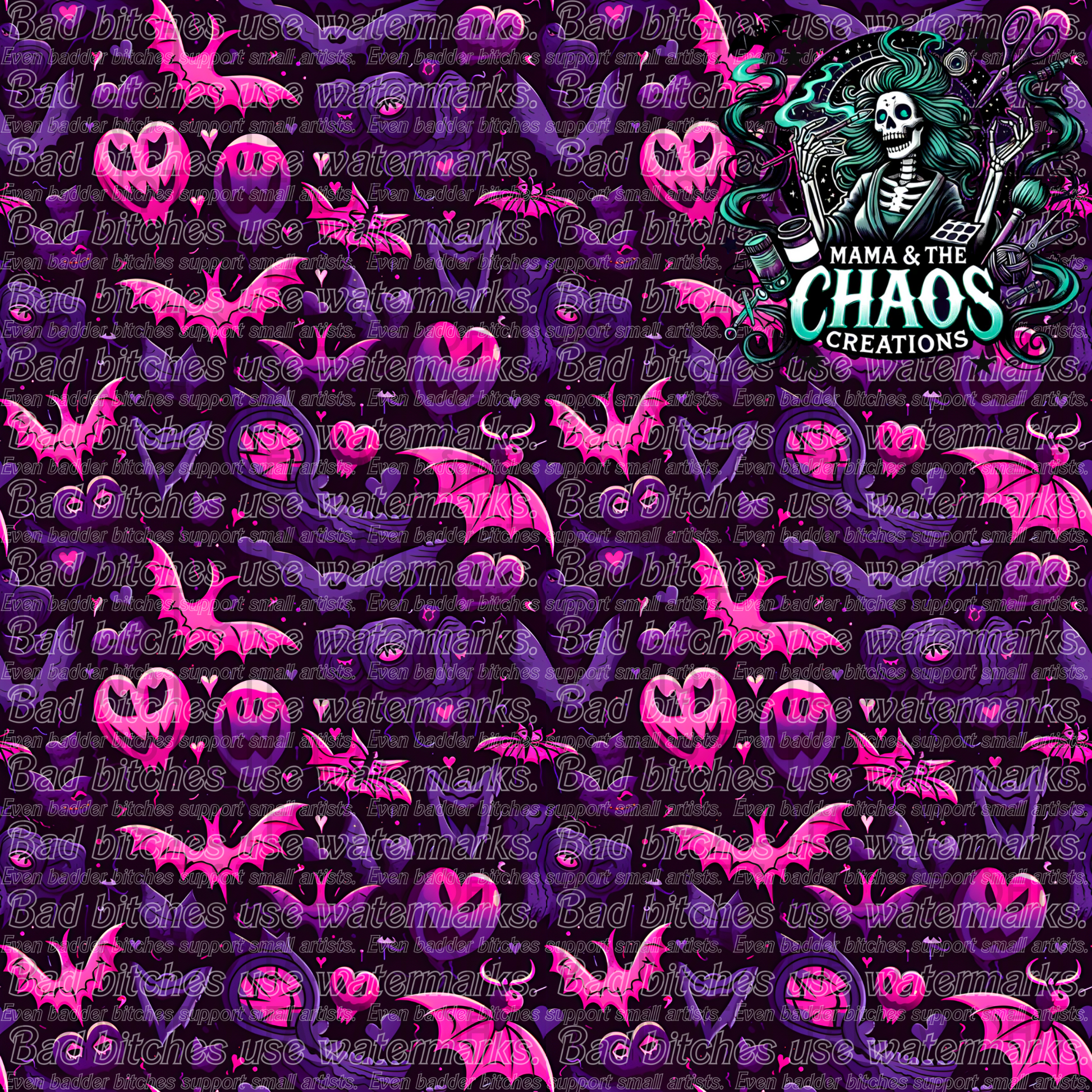 Welcome to the dark side—we’re sparkly, spooky, and slightly unhinged. These handmade scrunchies and headbands are drenched in neon pink bats, glowing jack-o’-lantern hearts, gothic gravestones, and little flashes of spooky sass. Set on a deep, moody purple backdrop, it’s giving glam goth Halloween 365 days a year.